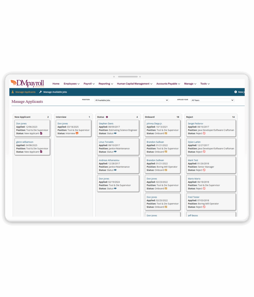 Unlike off-the-shelf hiring platforms, DM Payroll Solutions adapts its software to match your hiring process. Whether you’re managing a few candidates or hundreds, our system is flexible, intuitive and scalable to meet your needs.